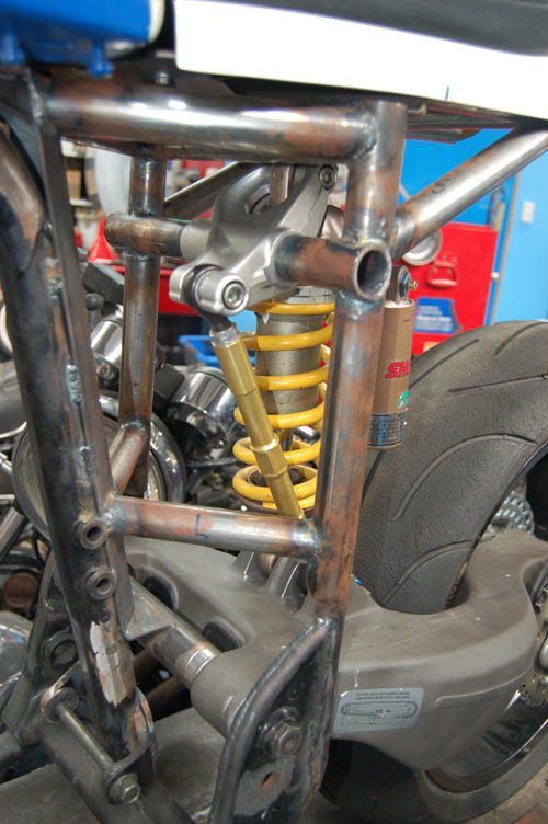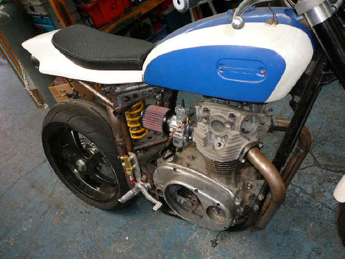 Daryl's latest pics show his exhaust mock-up with Akropovic muffler mounted under the seat, pipes I'm guessing are 44mm diam. tucked in between the frame rails for cornering clearance and converging into one pipe near the rear of the motor before sweeping up to the muffler. Very neat and tidy and looking great, can't wait to hear it in action! UPDATE (16/11/07) It's been quite a while since I caught up with Daz and his tracker so while I was in Melbourne today I called in to see how things were progressing. The bike has been stripped down again so Daz can finish the frame, you know the sort of thing, a bit of extra strength here and a bracket there, all good stuff as it make the day it's finished even closer. Some nice newly welded frame gussets And a few more just for good measure. As so it goes until the day it's ready for painting, hopefully very soon. Daryl has also been busy with the motor and the crankcases are now buttoned up with the crank and gearbox inside. All the other parts are ready to bolt on and only minor modifications to the gear selector shaft and dry clutch are holding up the works. So with a bit of luck, and a few weekends to work on the bike uninterrupted, Daryl tells me he will have it finished. It will be at the next AGM in all it's glory. Update (13/2/08) I called in to see Daz yesterday and to drop off a clutch I had converted for him and I bought my camera along as usual to see if any progress had been made on the tracker. Still some work to do but progress is being made. New muffler mount added to the corner gusset under the seat. Rear brake master cylinder attached to the frame Battery fitted under the single sided swing arm. 36mm Mikuni round slide carburettors and K&N filters will be used. Only a few minor brackets and gussets to complete the frame before painting it black.